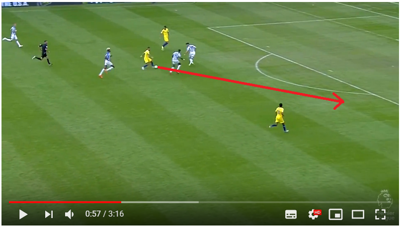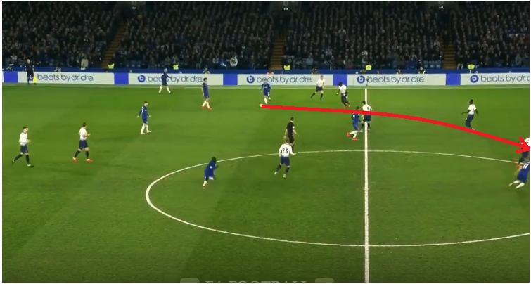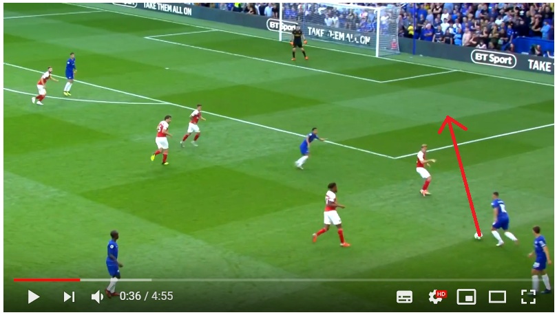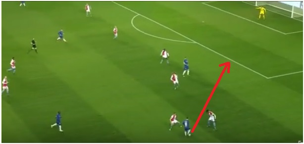 - Správné řešení - Tak by to mělo vypadat, bek v náběhu, tak mu pošlu balon, přihrávka vzduchem ideální, jedinou chybou akce je, že se za balonem žene i Giroud, přitom si měl nabíhat na přihrávku od Emersona.