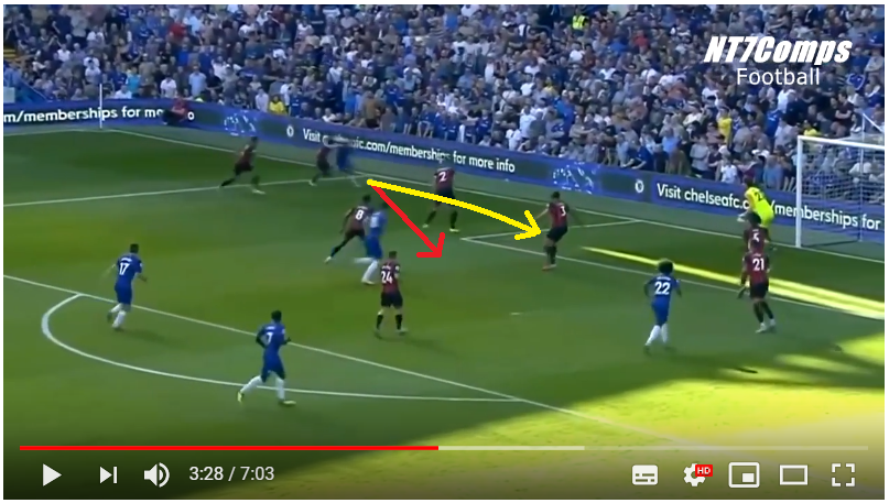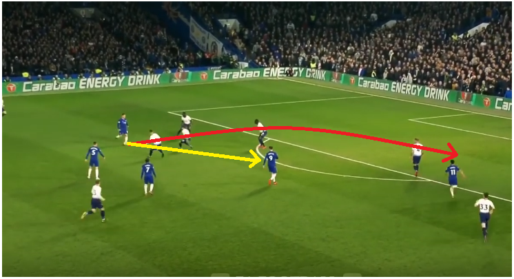 - Špatné řešení - Přihrávka na Williana (žlutá barva) nic neřešila, tady by bylo ideální dát mít Kovačićovi a nabíhat si přes Smallinga na hrot pro finální přihrávku.