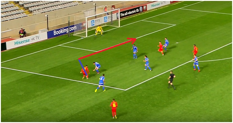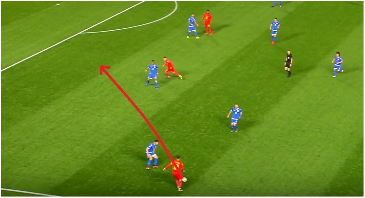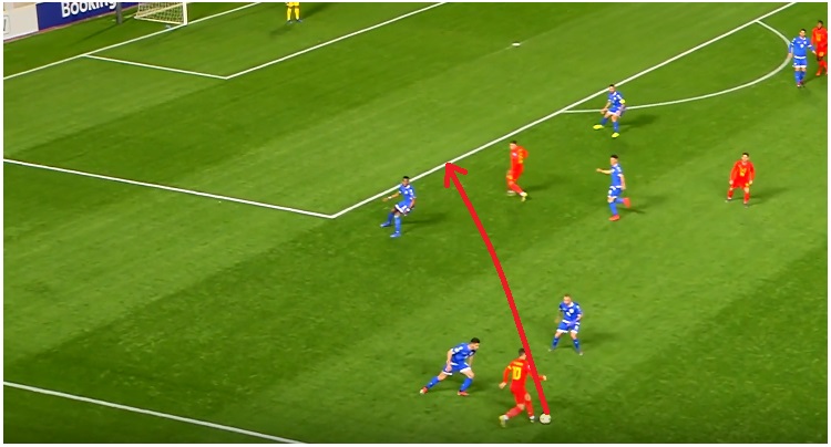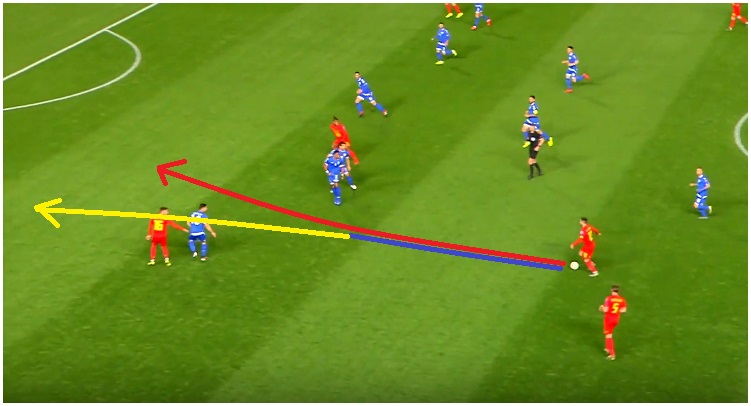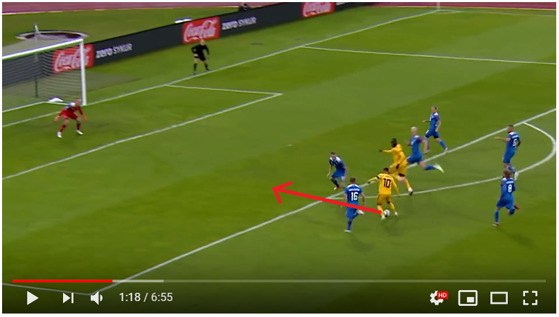 - Špatné řešení - Sice tam prošel, ale pozdě, většina hráčů včetně Mertense jakožto toho v nejlepším náběhu a postavení už přeběhla a nebylo tam místo, ta klička měla být mnohem rychlejší a přímočařejší.