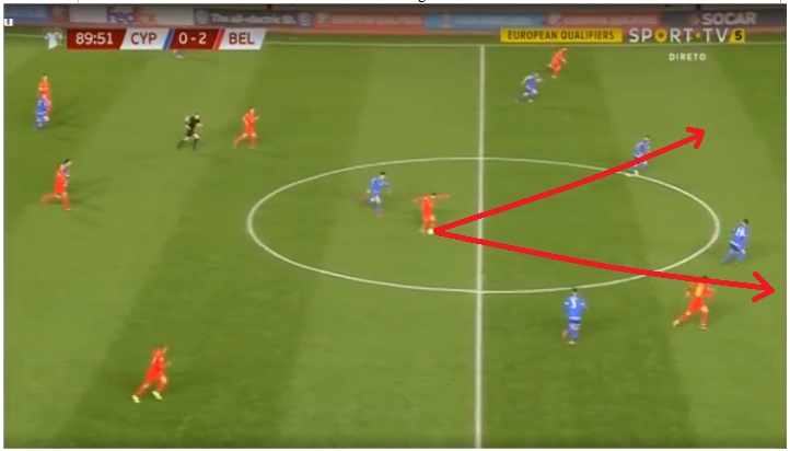 - Správné řešení - Januzaj (napravo) by byl asi lepší volba než Carrasco (nalevo), ale Eden se dostal ve správném prostoru k míči, zvedl hlavu, viděl spoluhráče v náběhu a okamžitě mu to poslal... sice to nevyšlo, ale tak bych si to představoval.