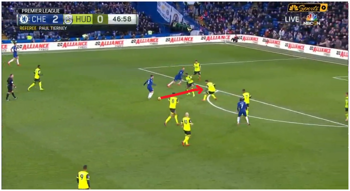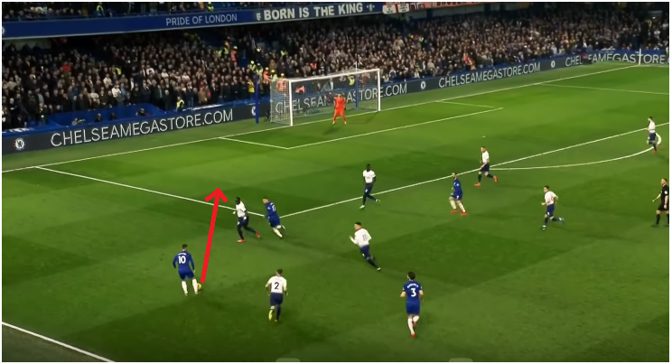 - Špatné řešení - Zaprvé si mohl kolem obránce hodit delší dotek na střed a střílet na zadní, nebo mohl nahrát Emersonovi, který by měl možnost z první poslat finálku na Williana, nebo zaseknout na střed a hledat vzdušným pasem Williana (nejtěžší varianta)... místo toho to Eden předržel a nic...