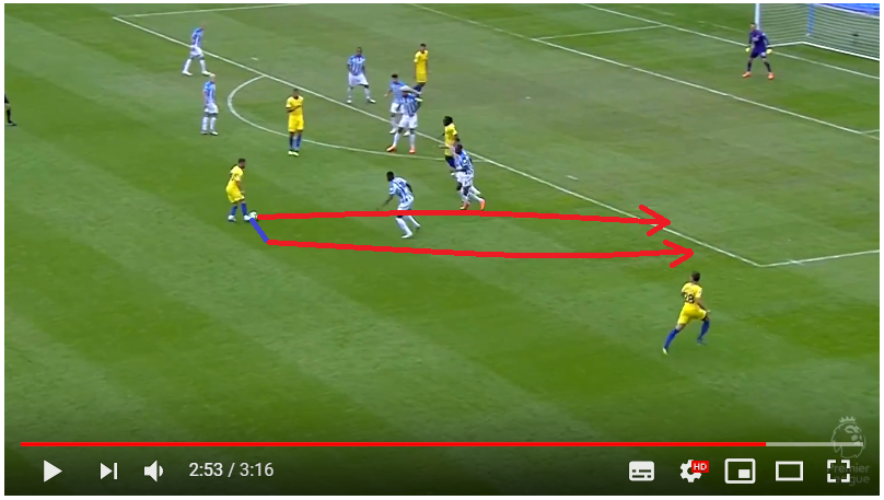- Ucházející řešení - Giroud v náběhu, Eden ho vidí a přihrává, ale podle mě ho zbytečně zahnal do úhlu (žlutá barva), i když mohl dávat kolmici mezi dva obránce (červená barva) jako tady Özil, kde byla dostatečná mezera... i tak každopádně dostal Girouda do šance, odkud se dá vstřelit branka (jako tady od Pogby proti Fulhamu například), takže o špatném řešení nemůže být vůbec řeč.