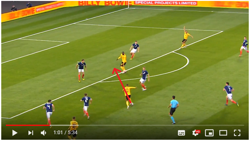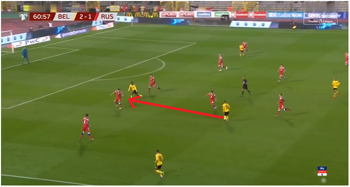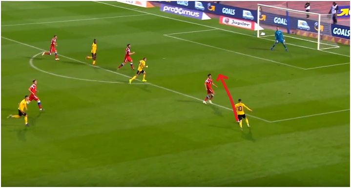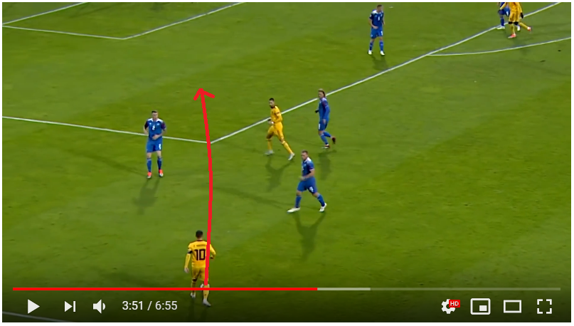 - Šprávné řešení - Eden se typicky parádním driblinkem dostane do skvělé pozice pro přihrávku a výborně našel Batshuayie... možná těsně předtím mohl nahrát Thorganovi, ale jen těžko říct, která volba by byla lepší.
