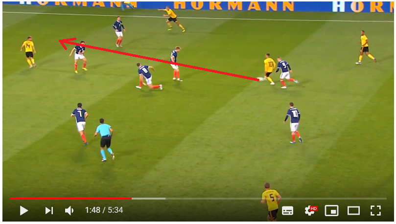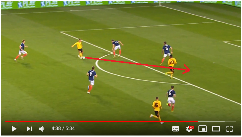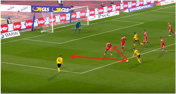 - Špatné řešení - Tady to chtělo přihrávku do kroku na Thorganovu pravačku jako tady od Klaasena, aby si to Thorgan mohl první dotekem píchnout do běhu a zakončit.