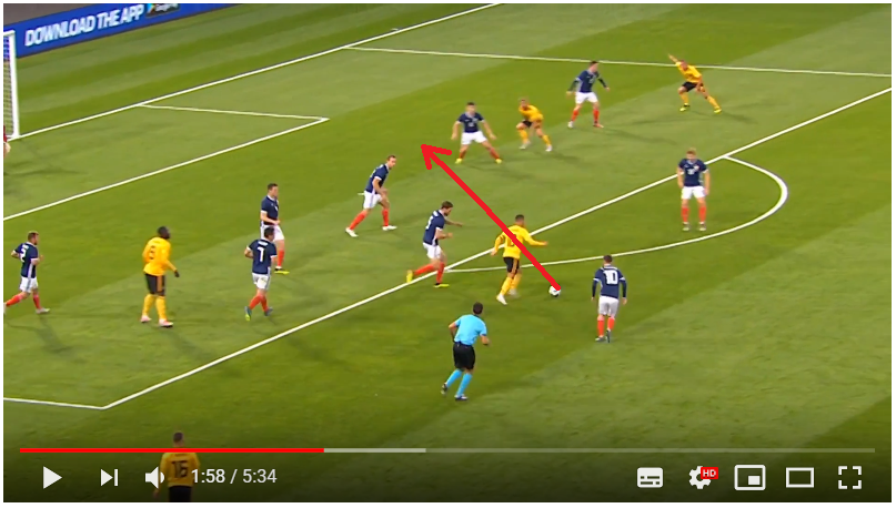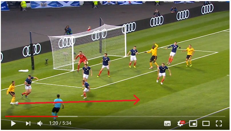 - Špatné řešení - Od Edena trestuhodné, mezi Lukakem a golmanem soupeře je velký prostor, kde by Lukaku mohl rychlostí obránce smáznout asi jako tady, navíc ta mezera pro přihrávku mezi obránce je obrovská, takže fakt nechápu, proč tady nepřišla přihrávka.