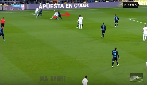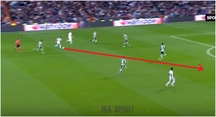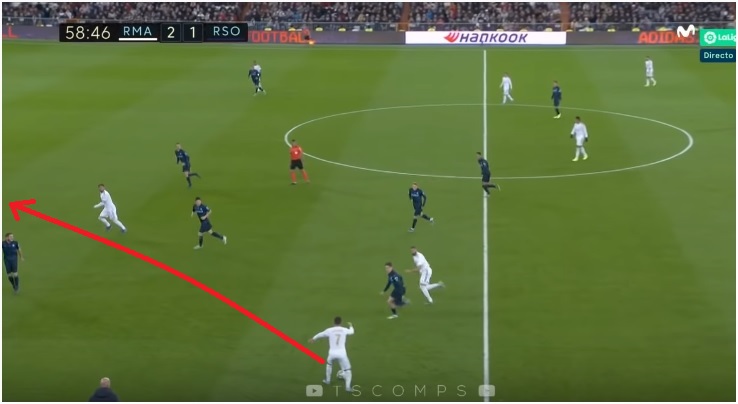 - Špatné řešení - Vinícius v náběhu s velkou rezervou na ofsajd lajnu, Eden ho vidí, ale nepřihrává a vede míč raději do středu. Velká chyba, Vinícius by šel sám na bránu a pro Edena to byla docela snadná přihrávka). Mohl to hrát šajtlí, placírkou mezi obránci nebo vzduchem.