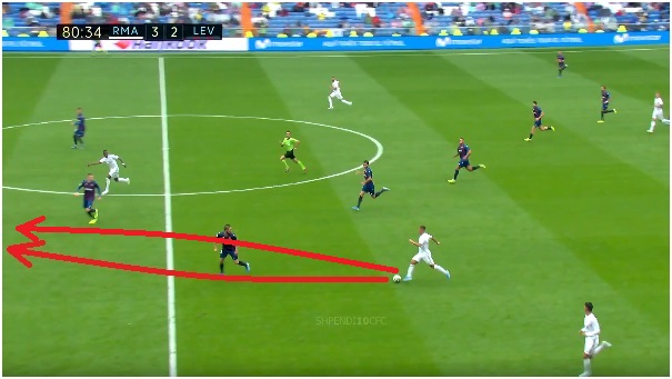 - Špatné řešení - Benz v dobrém náběhu, Eden ho vidí, ale radši hraje do šířky. Přihrávka ne úplně snadná, ale proveditelná jako např. tady proti Arsenalu. Špatně.